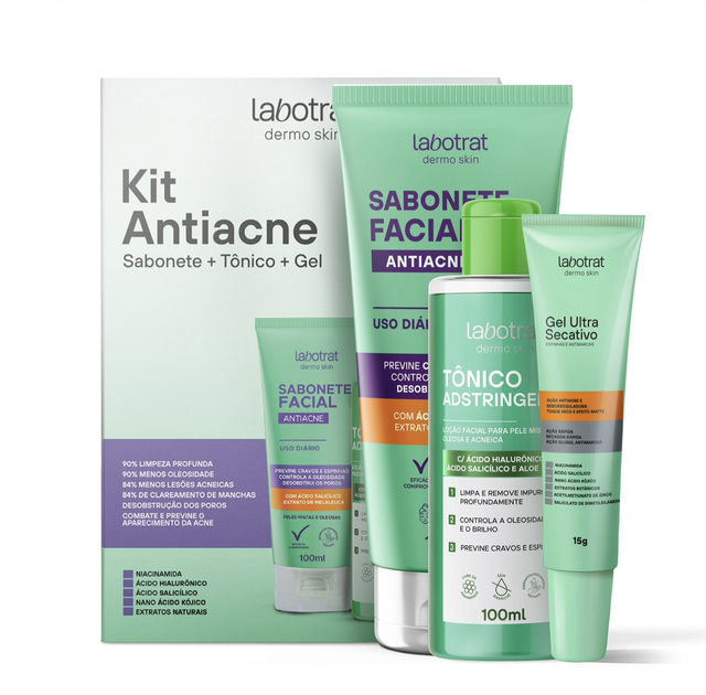 - Conteúdo: 1 Sabonete Facial AntiAcne 100ml + 1 Tônico Adstringente 100ml + 1 gel ultrasecativo 15g